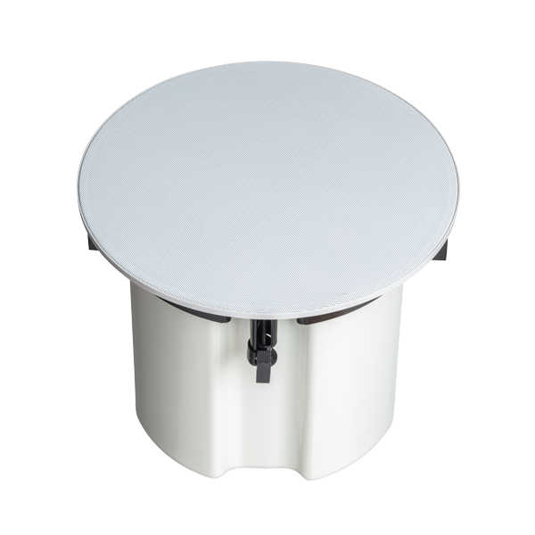 The 10W powered speaker is equipped with a 165mm 2-way system with neodymium tweeter and a 100V transformer with 4 power adjustments. The powder coated metal similar in RAL 9010 guarantees long-term stability. Quick and easy mounting with spring clamps and short tension distance. The speaker is connected by a 2-pin push-clamp. Perfectly suitable for installations where high sound quality is needed. This speaker is suitable for a ceiling strength of about 2 – 45 mm. With regard to the variety of materials and manufacturers, we recommend to build in a sample of the speaker to match the requirements accurately.