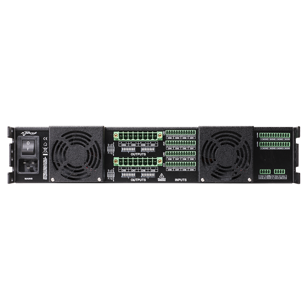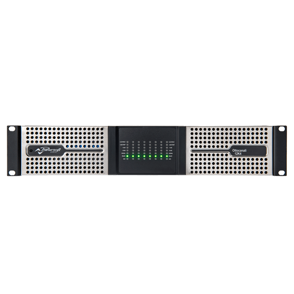 The Ottocanali 12K4 is a flexible and reliable 8-channel power amplifier with up to a total of 12,000 W at 4Ω, ideal for multi-zone applications in medium to large-scale installs: Ottocanali 12K4 supports any combination of lo-Z loudspeakers, mono-bridgeable channel pairs and 70V/100V Hi-Z distributed lines with no need for output step-up transformers. The Ottocanali 12K4 features switchable main/aux signal inputs and offers a wide range of system control, alarms, GPI/O and monitoring functions as well as sound shaping options.